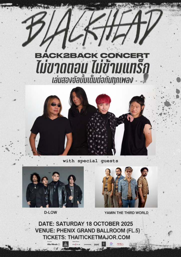 มาร่วมเป็นส่วนหนึ่งของหน้าประวัติศาสตร์ครั้งสำคัญ กับคอนเสิร์ตใหญ่ของตำนานร็อคยุค 90s ที่ทุกคนรอคอย After Miracle Plus & Siam Experience present BLACKHEAD: BACK2BACK CONCERT” จะจัดขึ้นในวันเสาร์ที่ 18 ตุลาคม 2568 ณ Phenix Grand Ballroom ชั้น 5, ฟีนิกซ์ ประตูน้ำ ประตูเปิดเวลา 18.00 น. และเริ่มการแสดง 18.30 น. บัตรราคาเดียว 1,200 บาท (บัตรยืน) ซื้อบัตรได้แล้ววันนี้ที่ ไทยทิคเก็ตเมเจอร์ ทุกสาขา และทางเว็บไซต์ www.thaiticketmajor.com
