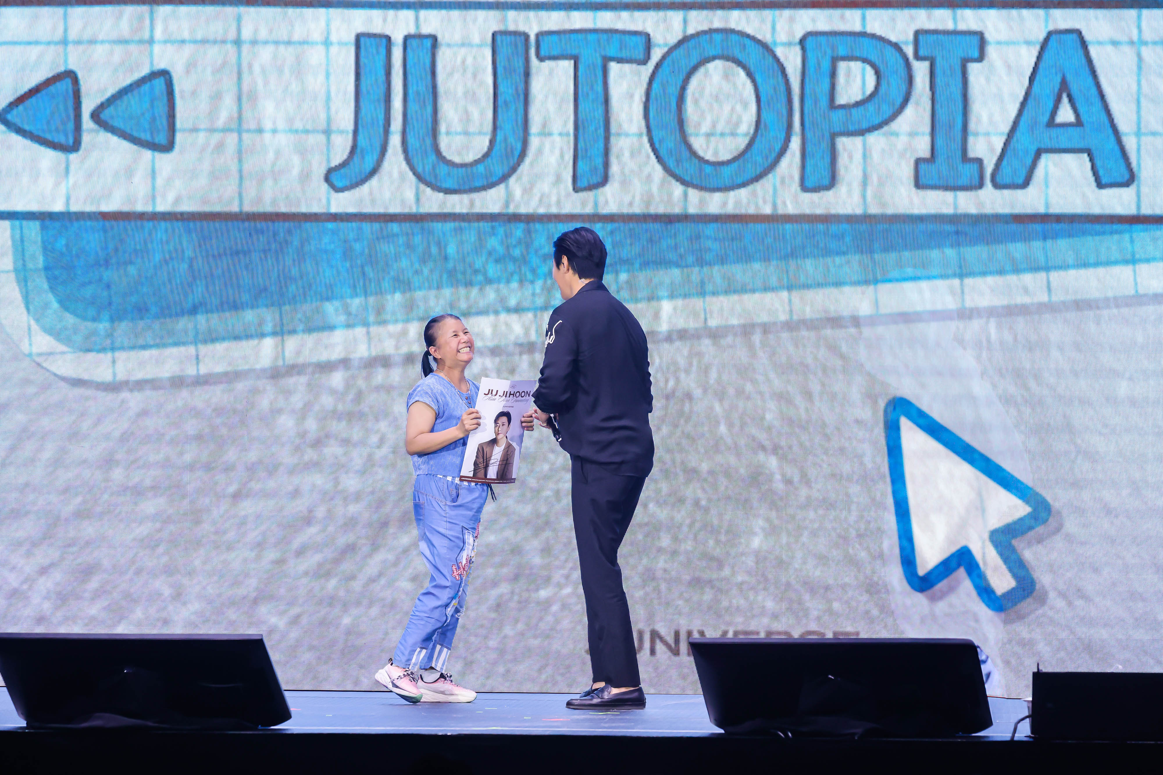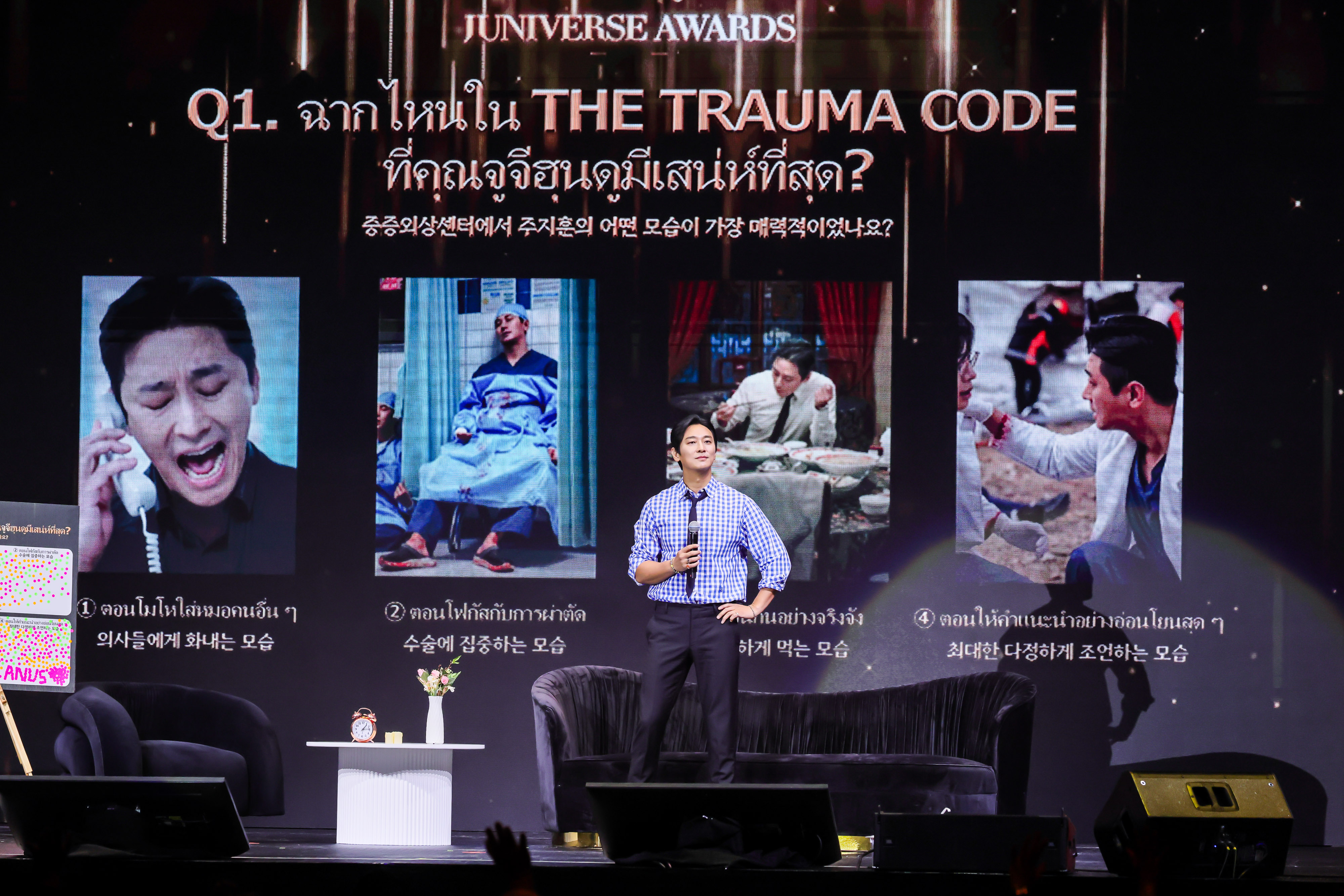 บรรยากาศในฮอลล์เต็มไปความตื่ นเต้น และเสียงกรี๊ดจากแฟน ๆ เมื่อจูจีฮุนเปิดตัวกับเสียงร้ องสุดละมุนในเพลง ‘You Are In My Arms’ พร้อมรอยยิ้มแสนอบอุ่นราวกับหลุ ดออกมาจากจอ ก่อนจะพาทุกคนเข้าสู่จักรวาล ‘JUNIVERSE’ พูดคุยแบบเต็มอรรถรสถึงผลงาน และเรื่องราวต่าง ๆ ของเขาอย่างเป็นกันเอง แต่ที่ทำเอาแฟน ๆ กรี๊ดจนแทบเจ็บคอคงหนีไม่พ้ นอาการเขินของโอปป้าคนเท่ ที่แอบออกตัวว่าเป็นสเปกของทุ กคนเพราะบทบาทในซีรีส์ แต่กลับโดนแฟนคลับตะโกนแซวกลั บว่าเพราะความหล่อนี่แหละใช่ เลย!! เจ้าตัวถึงกับยิ้มน้อยยิ้มใหญ่ แล้วเสิร์ฟเซอร์ไพรส์แรกต่อทั นที ด้วยการแจกภาพโพลารอยด์ที่ถ่ ายเองบนเวทีพร้อมลีลาเซลฟี่ แบบไม่ห่วงหล่อให้กับแฟนคลับผู้ โชคดี งานนี้แฟน ๆ ยิ่งหลงความขี้เล่นจนใจละลาย กรี๊ดกันไม่มีหยุด ไม่มีคำว่าเหนื่อย! ความสนุกยังต่อเนื่องแบบยิ งยาวกับช่วง JUNIVERSE AWARD ที่เปิดให้แฟน ๆ ร่วมโหวตเรื่องราวเกี่ยวกับจูจี ฮุน พาร์ทนี้ทั้งสนุกทั้งเรียกเสี ยงหัวเราะได้แบบสุด ๆ ต่อด้วยช่วงตอบคำถามที่แฟนคลั บในงานเขียนถึงจูจีฮุน บอกเลยว่าแต่ละคำถาม แต่ละคำขอ คอมพลีทกันแบบจัดเต็ม โอปป้าคนดีไม่ทำให้ผิดหวัง ขออะไรก็ให้หมด แจกไม่กั๊กเลยทีเดียว