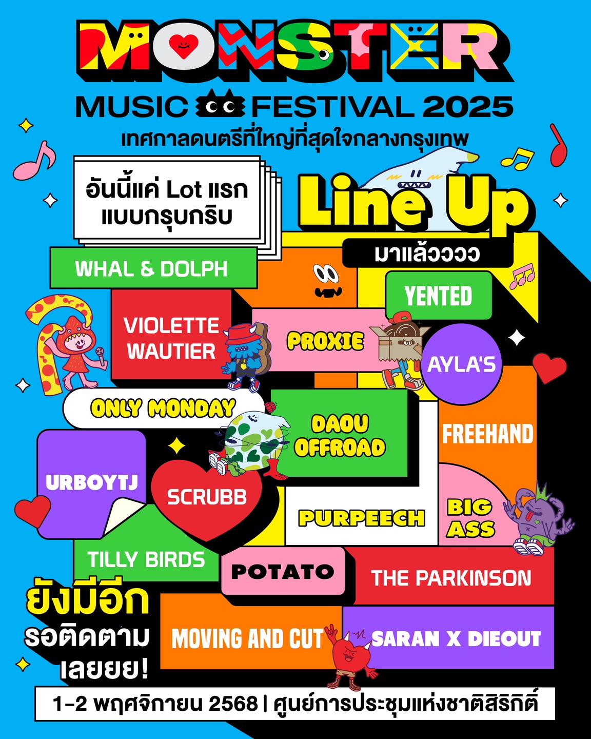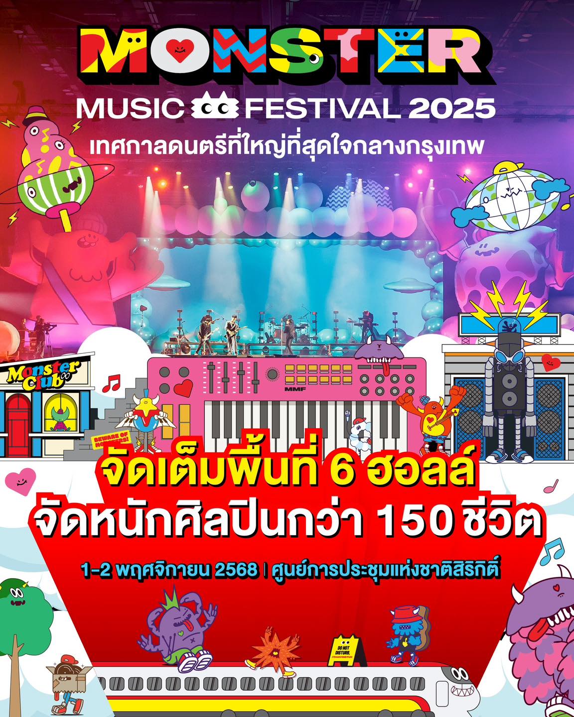 ความสนุกครั้งใหม่กำลังจะกลับมากับ เทศกาลดนตรีที่ใหญ่ที่สุดใจกลางกรุงเทพ “Monster Music Festival 2025” (มอนสเตอร์ มิวสิค เฟสติวัล 2025) พร้อมระเบิดความสนุก แบบนอนสต็อปตลอด 2 วันเต็ม 6 ฮอลล์ ในวันเสาร์ที่ 1 และอาทิตย์ที่ 2 พฤศจิกายน 2568 ณ ศูนย์การประชุมแห่งชาติสิริกิติ์ เตรียมตัวให้พร้อม เพราะงานนี้จัดใหญ่ไฟกระพริบ! โดยทีม GFest ผู้จัดเทศกาลดนตรี Rock Mountain และ Rock On the Beach หน่วยงานภายใต้ GMM SHOW ผู้จัดงานคอนเสิร์ตและเฟสติวัลที่ดีที่สุดของประเทศไทย ขนโปรดักชัน แสง สี เสียง ระดับพรีเมียม มาเอาใจแฟนๆ ในงานนี้