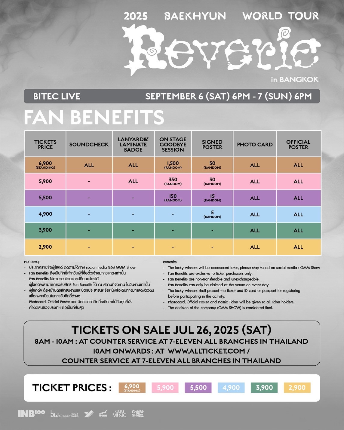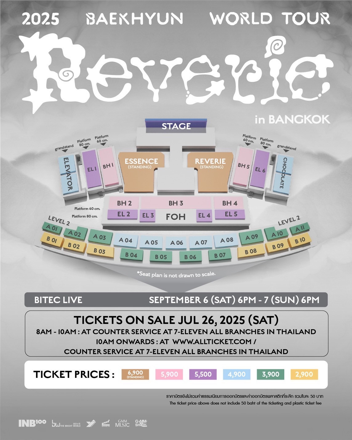 ราคาบัตร : 6,900 (บัตรยืน) / 5,900 / 5,500 / 4,900 / 3,900 / 2,900 บาท