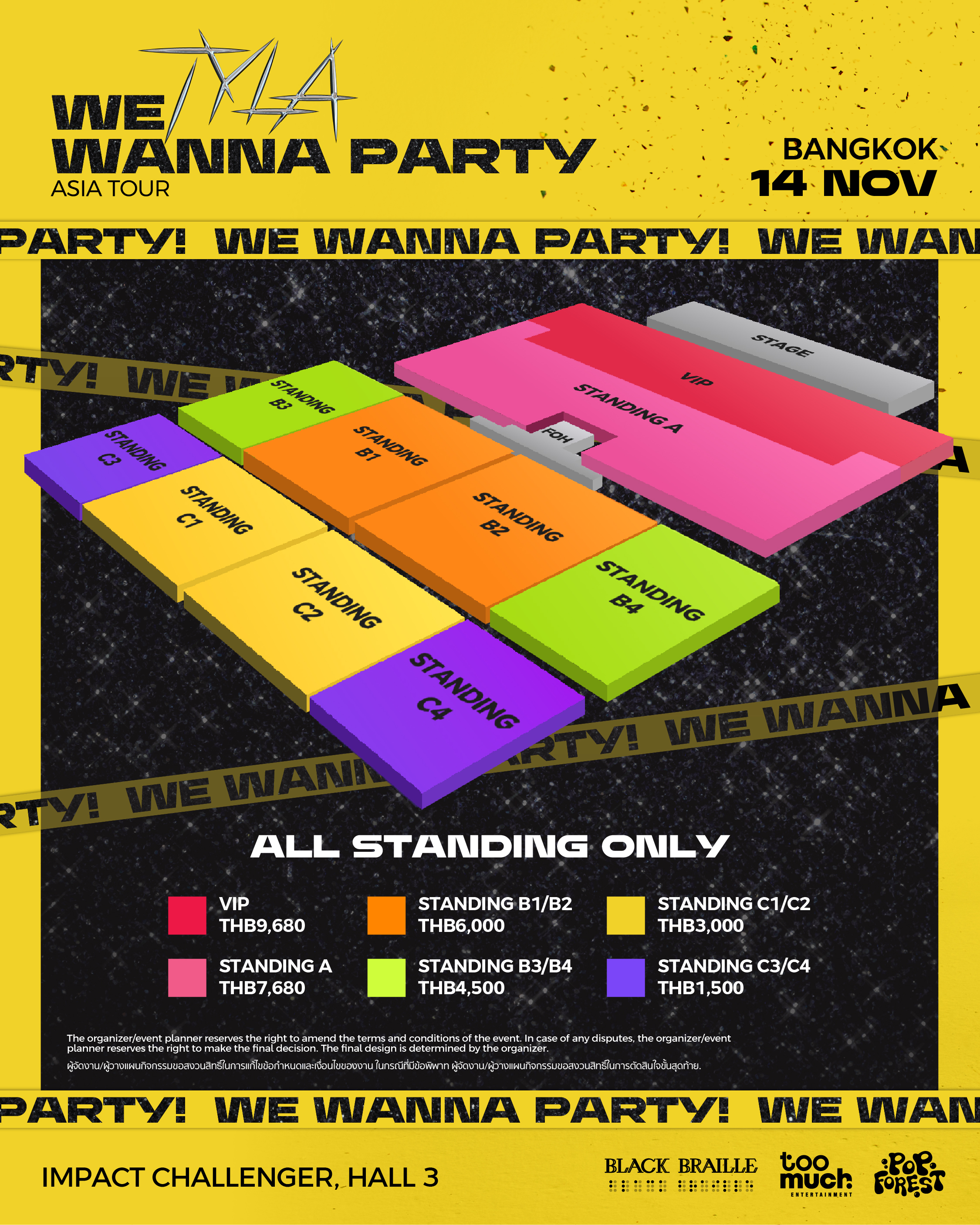 เมื่อแฟน ๆ ขอมา เราจัดให้! กับการเพิ่มโซนใหม่พร้อมราคาปรับใหม่ให้โดนใจ เพื่อโชว์นี้ที่กรุงเทพฯ โดยเฉพาะ เพื่อมอบความคุ้มค่าให้แฟน ๆ ของเรา เตรียมตัว เตรียมใจ และปล่อยจอยไปกับปาร์ตี้ TYLA WE WANNA PARTY ASIA TOUR in Bangkok ได้แล้วในวันที่ 14 พฤศจิกายน ณ Impact Challenger Hall 3  โดยบัตรราคา 9,680 บาท / 7680 บาท /  6,000 บาท / 4,500 บาท / 3,000 บาท / 1,500 บาท สามารถซื้อได้แล้วทาง Megatix ตั้งแต่วันที่ 17 กันยายนเป็นต้นไป