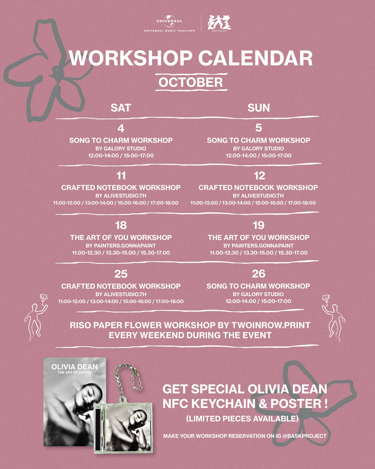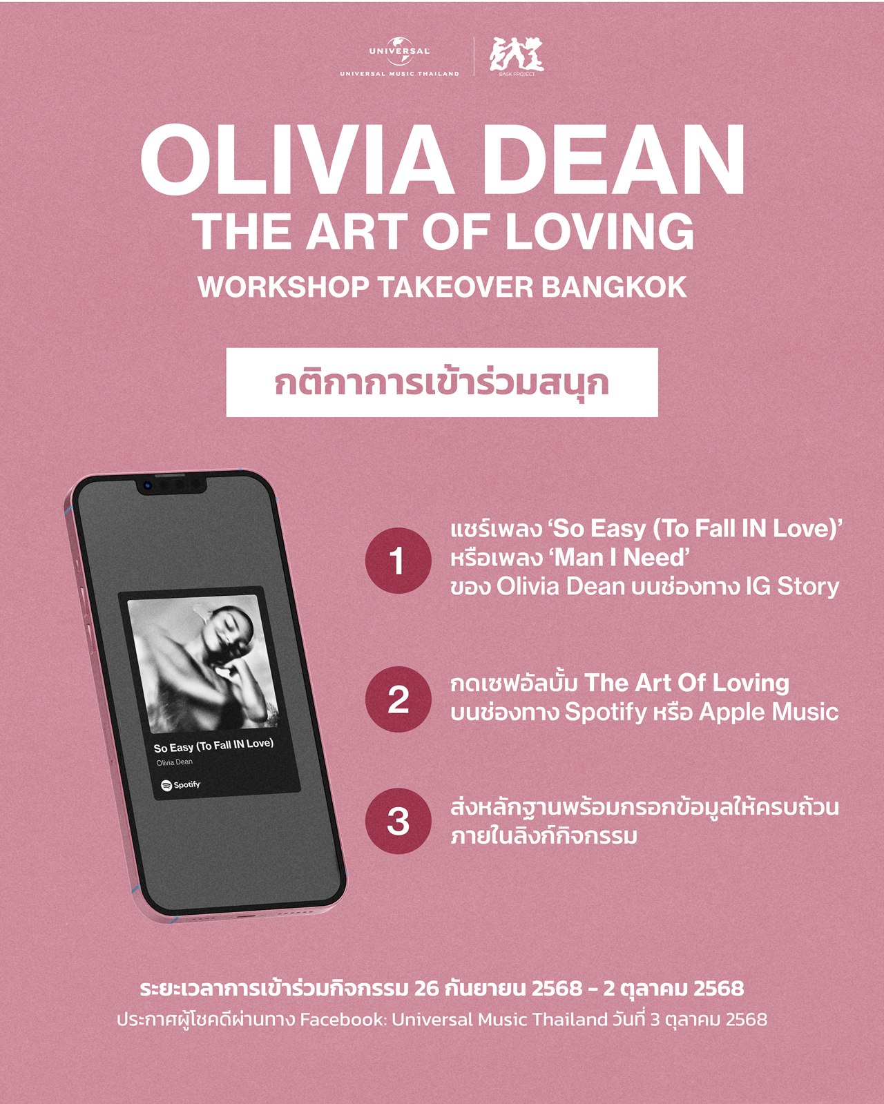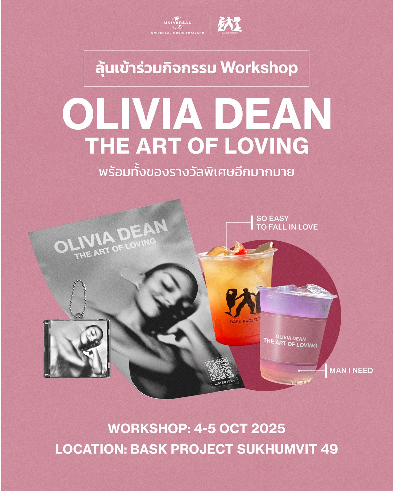 พิเศษที่สุดกับแฟน ๆ ชาวไทย ที่จะได้ร่วมฉลองอัลบั้ม The Art Of Loving ของ Olivia Dean ไปด้วยกัน ผ่านเวิร์คช็อปสุดชิคที่สายอาร์ตและสายดนตรีได้มาเจอกัน กับ UMT X BASK PROJECT: Olivia Dean The Art Of Loving Workshop Takeover Bangkok ที่จะจัดขึ้นที่ร้าน Bask Project สุขุมวิท 49 ตลอดทั้งเดือนตุลาคมนี้ ทุกคนที่รักเสียงเพลง งานอาร์ต และสายคาเฟ่ จะได้ดื่มด่ำกับบรรยากาศเพลงเพราะๆ พร้อม กับ 4 กิจกรรมไลฟ์สไตล์สุดชิค ที่ได้รับแรงบันดาลใจจากอัลบั้ม The Art Of Loving ของ Olivia Dean ไม่ว่าจะเป็นเวิร์คช็อปงานคราฟสวย ๆ ที่ทุกคนสามารถร่วมกิจกรรมได้ งานนิทรรศการศิลปะจากโลคอลอาร์ตติส และเมนูเครื่องดื่ม-ขนมหวานที่ครีเอตขึ้นมาเป็นพิเศษเฉพาะงานนี้ซึ่งได้แรงบันดาลใจจากอัลบั้ม The Art Of Loving รวมถึงบรรยากาศการตกแต่งร้านในธีมเดียวกัน ดื่มด่ำไปกับเสียงเพลงและกิจกรรม Workshops สนุก ๆ ที่รังสรรค์มา เพื่อมอบประสบการณ์และความประทับใจให้กับทุกคนได้อย่างแน่นอน