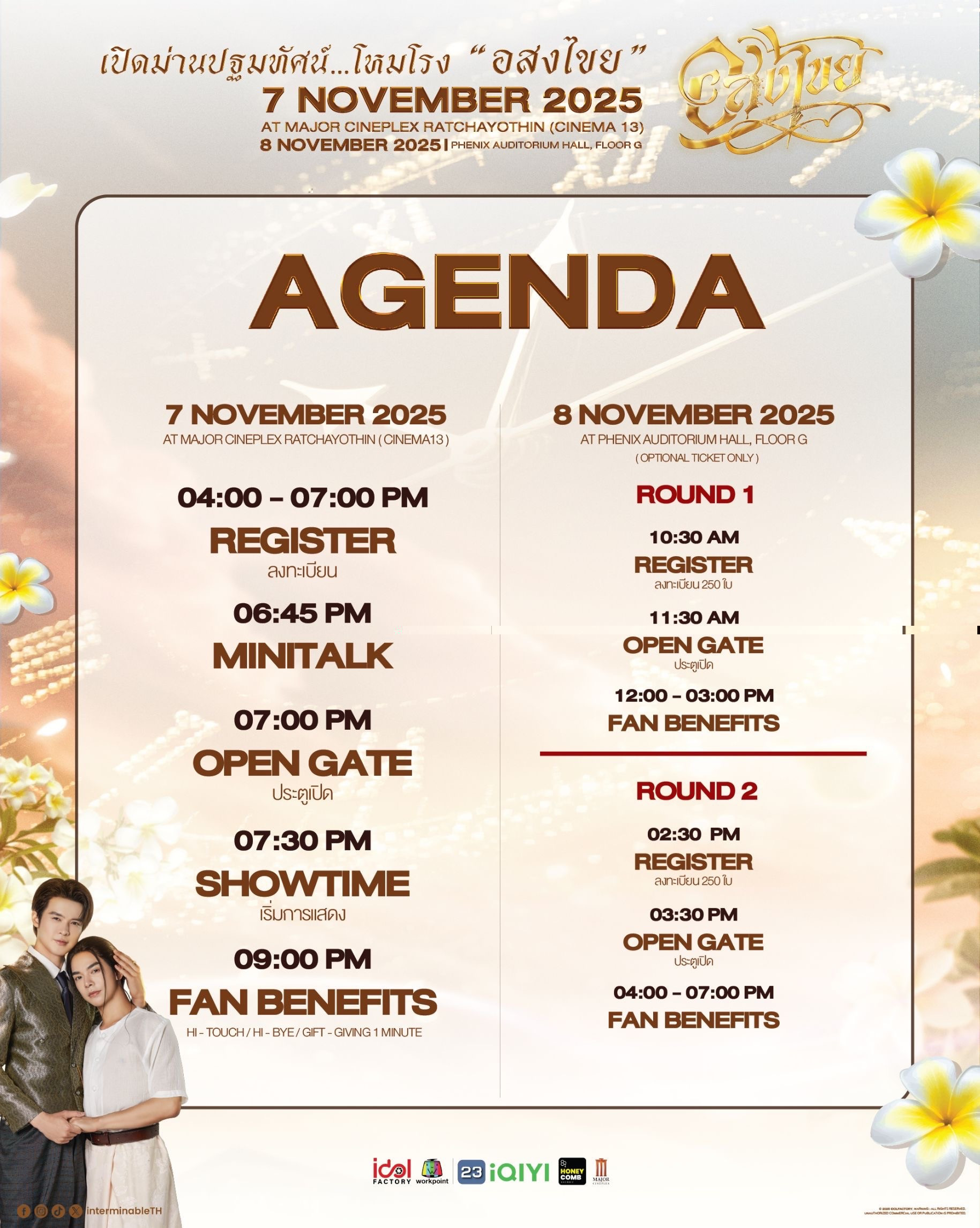 เตรียมรับชมตอนแรกของซีรีส์ “อสงไขย Interminable” เริ่มตอนแรก 7 พฤศจิกายนนี้      ออกอากาศทุกคืนวันศุกร์ เวลา 21:30 น. ทางช่อง Workpoint หมายเลข 23 และดูออนไลน์เวอร์ชัน UNCUT เวลา 22:30 น. บนแอป iQIYI และเว็บ http://iQ.com ที่เดียวเท่านั้น